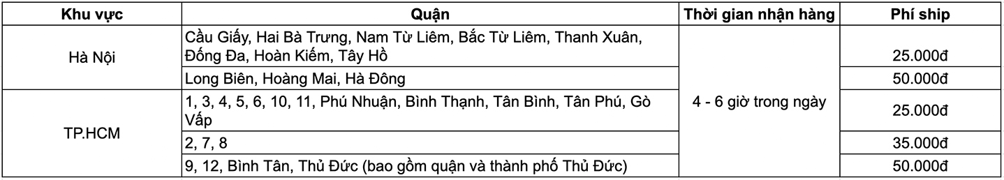 - Dịch vụ áp dụng cho toàn bộ các quận tại Hà Nội và TP.HCM. Thời gian giao hàng chi tiết các khu vực như sau: